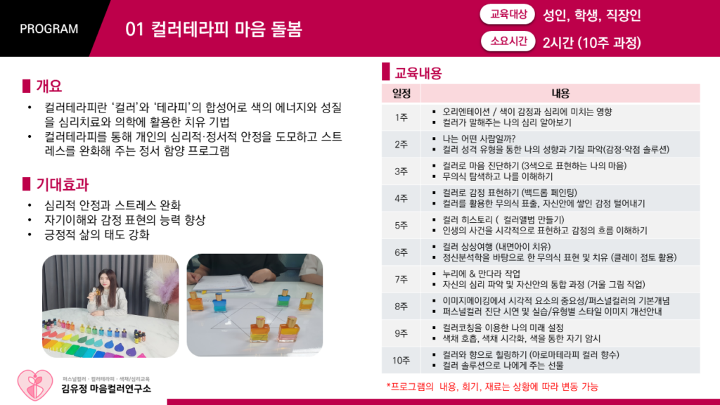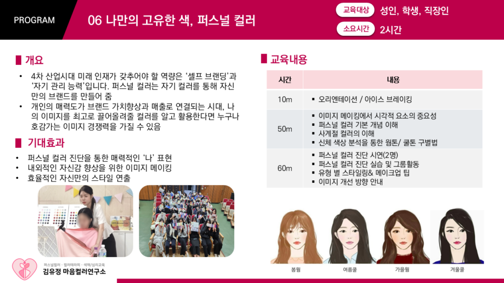 - 다양한 컬러테라피, 퍼스널컬러, 골격진단 프로그램 제공