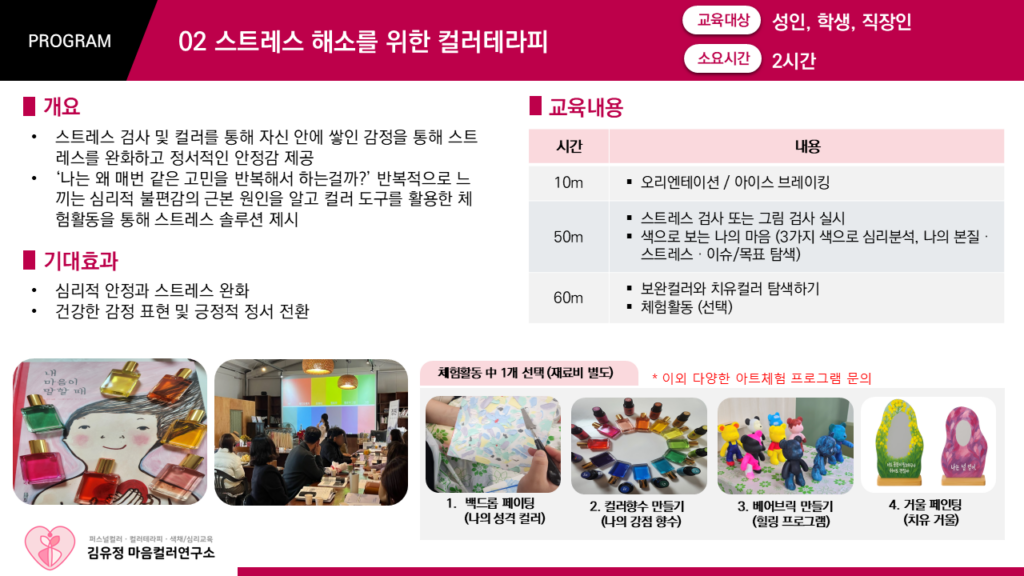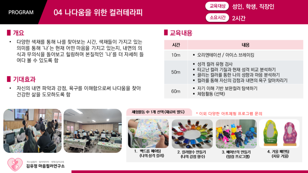 김유정 마음컬러연구소는 기업, 학교(초·중·고·대학교), 관공서 등 다양한 조직을 대상으로 맞춤형 강연 및 교육 프로그램을 제공합니다.